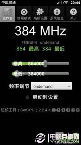 通过给CPU降频来省电,在需要极度省电的时候是个好办法864M只适合日常的使用,如UC.QQ。如果大家要玩游戏。建议调到1026M甚至更高(根据游戏大小调节)如果大家要看电影。建议调到918M甚至更高(根据电影分辨率和码率调节)下面的最低频率不用调节,也可以调大一点,但是不要比最高频率高。如果最低频率和最高频率调节到一样,即是传说中的锁频省电效果展示:#P#