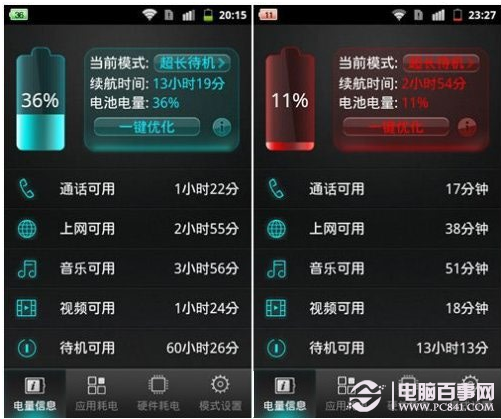 11,最详细的安卓手机省电妙招 是什么?第一招:找出耗电根源要想做到尽量省电,首先我们要知道手机的电量就用到了哪里,然后我们才能对症下药。我们可以打开手机的设置→关于手机→电池→电池的使用,查看电池点亮的使用情况。或者通过第三方软件查看应用程序的耗电情况。电池耗电情况通过以上图片我们能够看出,手机的绝大部分电量都被超大的显示屏幕耗去。另外,无线网络、手机电视以及游戏应用等也占用了不小的电量。除此之外,还有一些看不到用电情况却也想到耗电的设置,比如显示特效,按键反馈等。第二招:屏幕显示设置1 降低屏幕亮度。通过 设置->声音和显示设置->亮度 将屏幕亮度调整到不影响视力观看的最低亮度,可以有效的节省电量,对于支持光学感应器的手机也可以勾选 “Automatic brightness”根据外界的光线自动调节屏幕亮度。